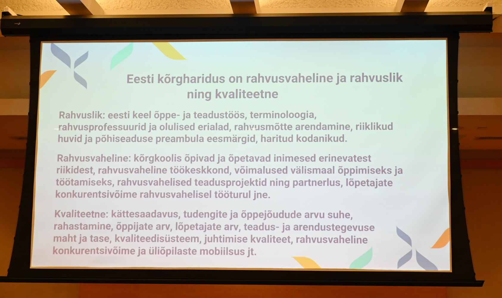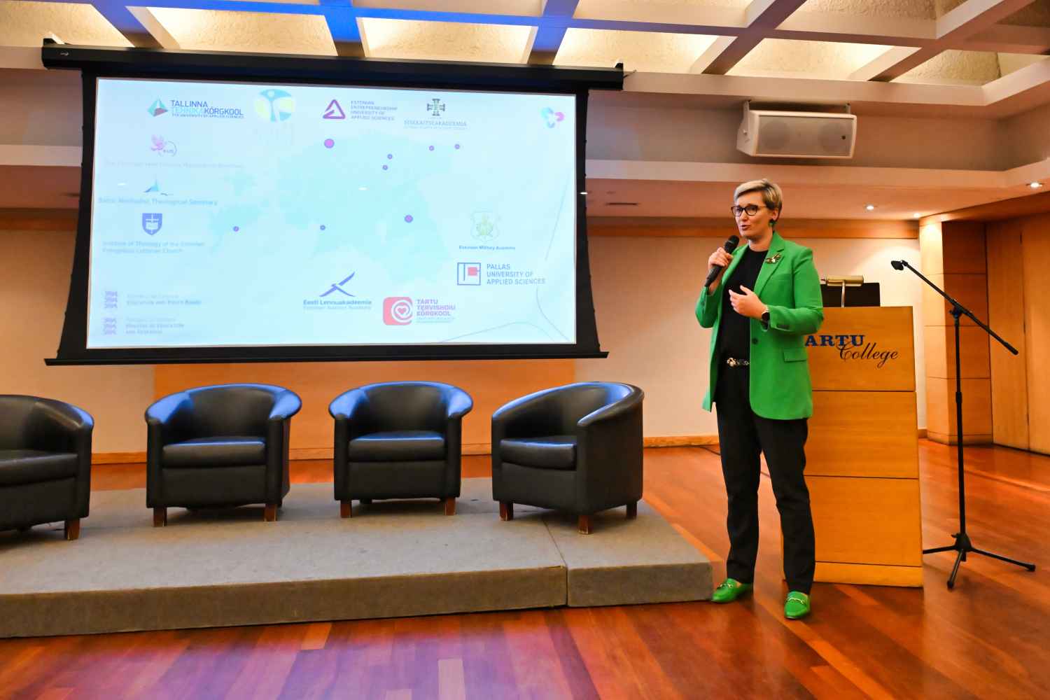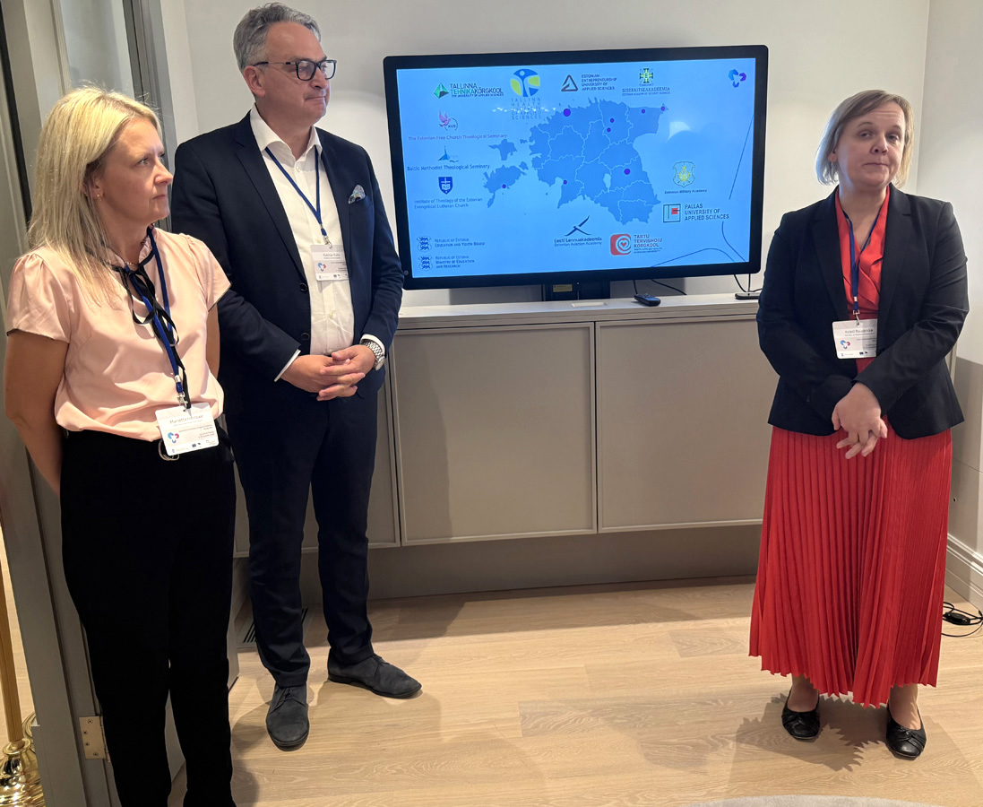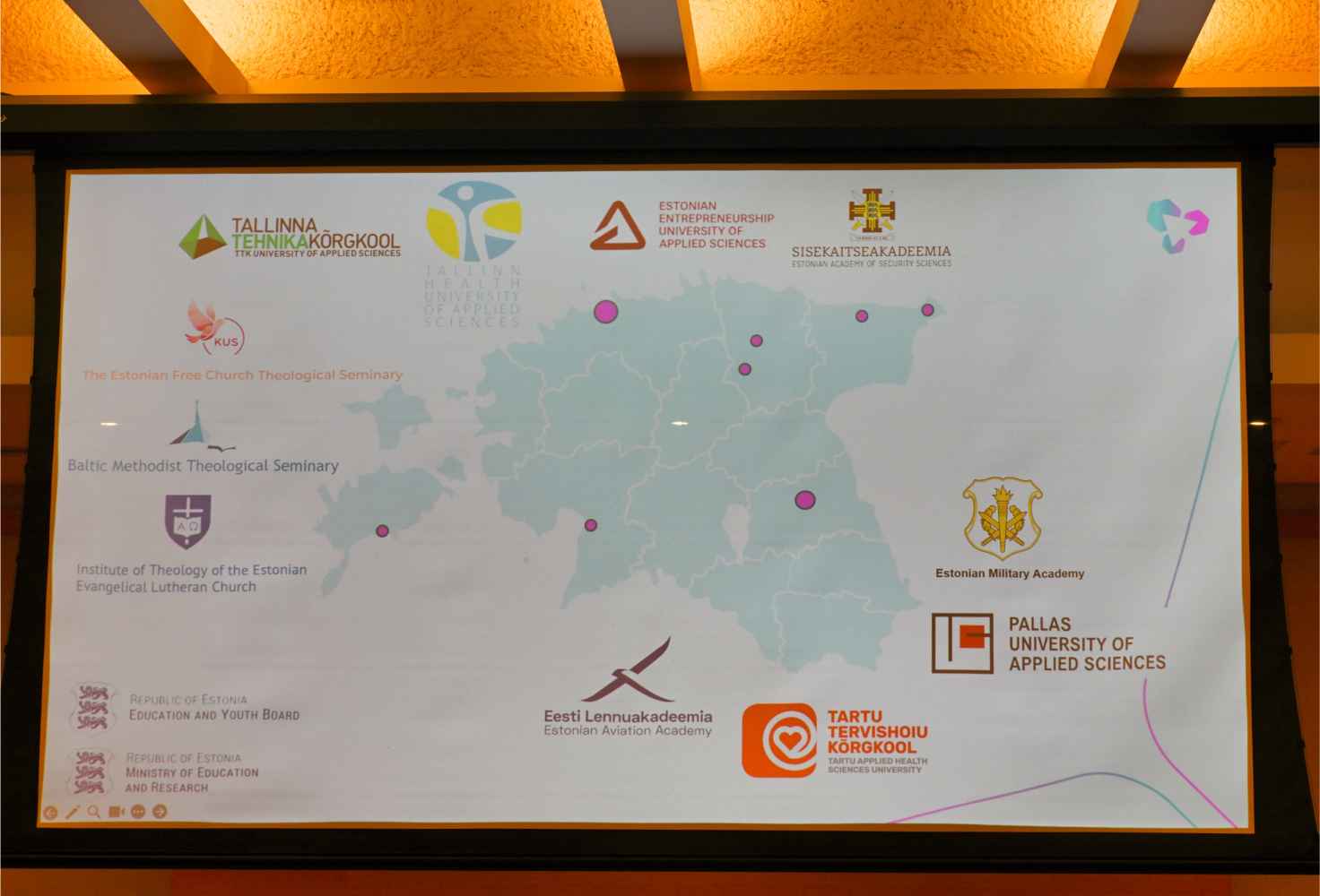 Suurele ekraanile oli kuvatud kaart, millel kaheksa suuremat ja väiksemat täppi, märkimaks ära, kus Eestis asuvad rakenduskõrgkoolid (universities of applied science / arts, siin ka colleges, academies, institutes).