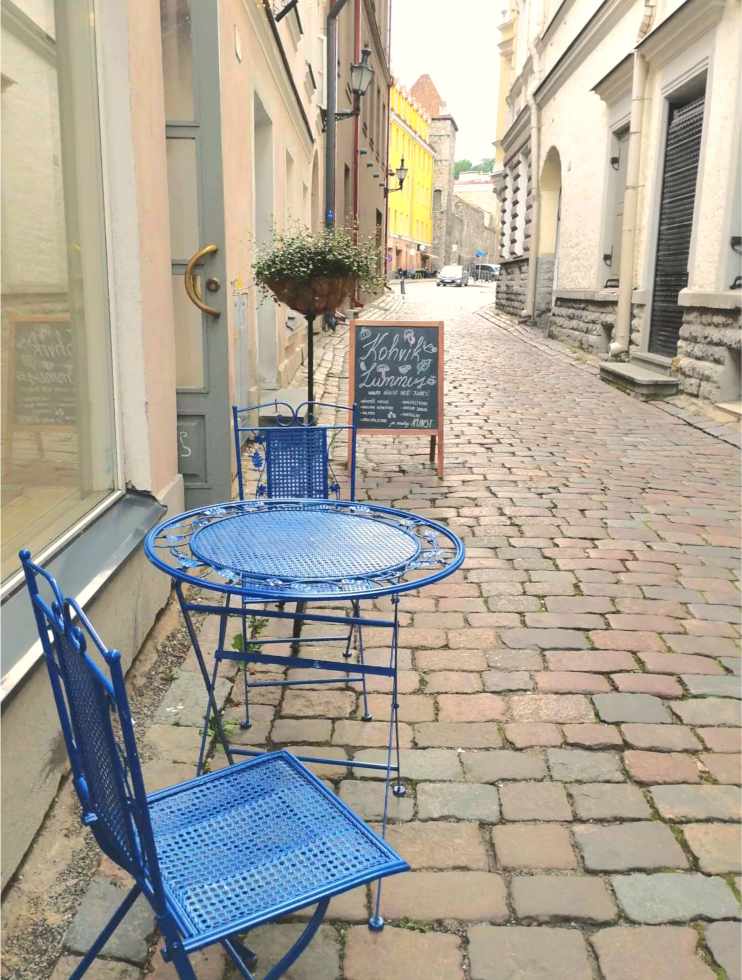 Blue chairs at the entrance of Lummus on Müürivahe Street in Tallinn’s Old Town (photo: Jerry Mercury)