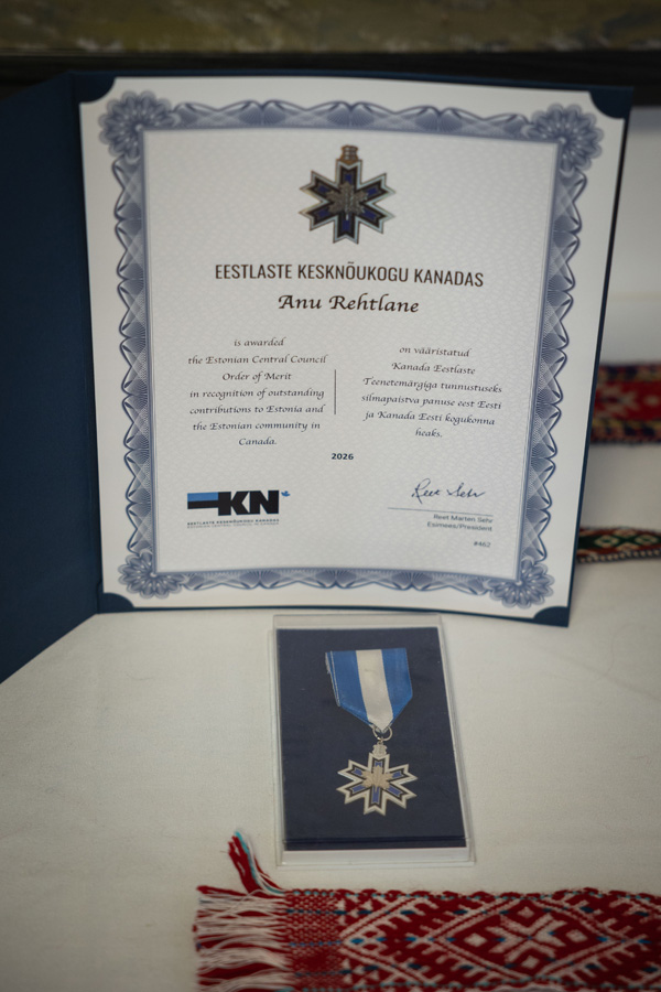 Presented by Ingrid Soide, a member of the medal committee and former executive director of Estonian Central Council in Canada, the Silver Medal of Merit from the Estonian Central Council in Canada was awarded to Anu Rehtlane. Although she was not able to accept the award in person, Anu was recognized for her steadfast dedication to the Vancouver Estonian community.
