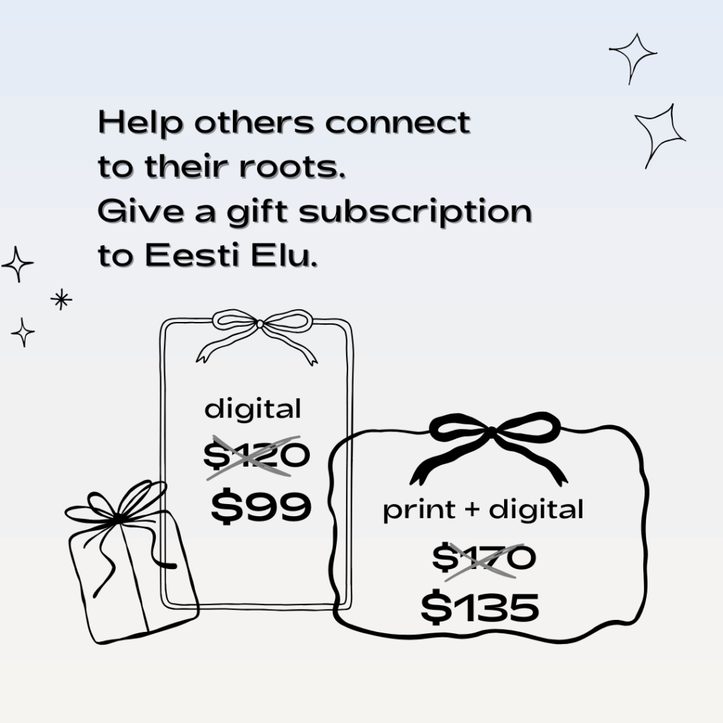 Finding a gift for the person who has everything requires intentionality. A subscription to Eesti Elu offers a meaningful connection to heritage, curated for those looking to deepen their cultural roots without moving across the ocean. Whether they are fluent in Estonian or just starting to explore their background, a subscription provides educational and entertaining articles and resources in both English and Estonian. This year, holiday gift subscriptions are available at a discount: $99 for a one-year digital subscription or $135 for print plus digital.