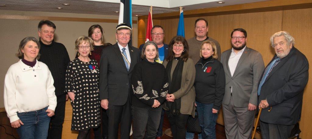 At the recent Consular/Central Council reception on Independence Day, Marcus Kolga (7th from left), president of the Central and Eastern European Coalition (CEEC), brought various dignitaries to the event at Tartu College, after the end of a Ukrainian rally at Nathan Phillips Square. Among the CEEC members are Reet Marten Sehr (3rd from left), m/c and chief organizer of the event that was revived after its temporary pause for some years. Laas Leivat (right) is an Estonian representative to the CEEC. Photo: Peeter Põldre