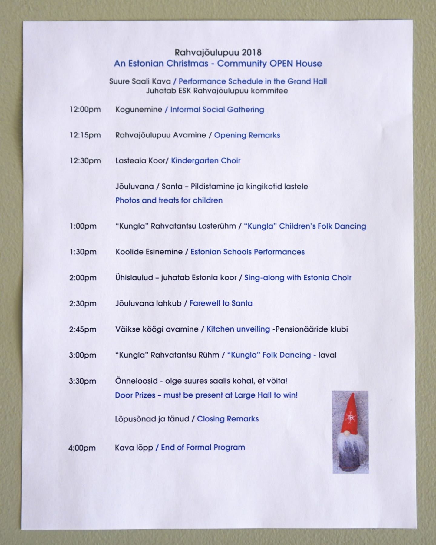 Laupäeval, 8. detsembril 2018.a toimus Eesti Sihtkapital Kanadas korraldatud traditsiooniline RAHVAJÕULUPUU, kuhu oli kogunenud väikeseid ja suuri nii lähedalt kui kaugelt. Taas oli publikul võimalus tutvuda meie kogukonna organisatsioonide tegemistega, nautida maitsvaid jõuluroogasid, kaasa elada nii muusikalistele kui ka tantsulistele eeskava numbritle. Kohal oli ka loomulikult JÕULUVANA:)