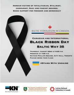 Black Ribbon Day serves as a reminder to us, as Canadians, of the fragility of democracy and that freedom should never be taken for granted. As Canadians, we can be proud that the concept of Black Ribbon Day had its origins right here in Toronto. This day was founded by former Estonian Central Council in Canada president, the late Markus Hess, who brought together community representatives in the 1980’s to form the International Black Ribbon Day Committee. By 1991, it had become a world-wide movement with pro-freedom and democracy demonstrations held around the world.