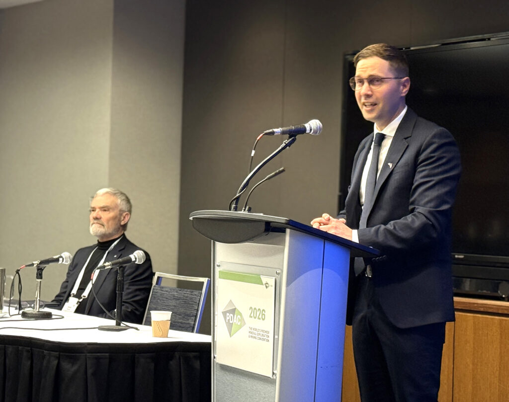 Jaanus Uiga esinemas PDACi raames 1. märtsil toimunud Eesti seminaril. Vasakul ürituse moderaator Kalev Ruberg (Karu Advisory Ltd) Vancouverist. Foto: © Ülle Baum