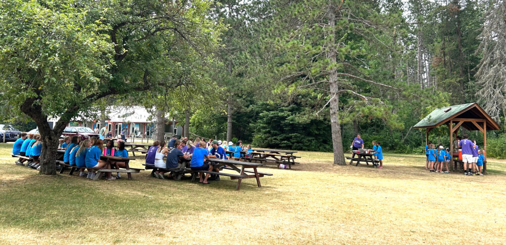 Esimesel fotol laagri avamine lipuheiskamisega; teisel laagripere sellele järgnenud esimesel lõunasöögil.