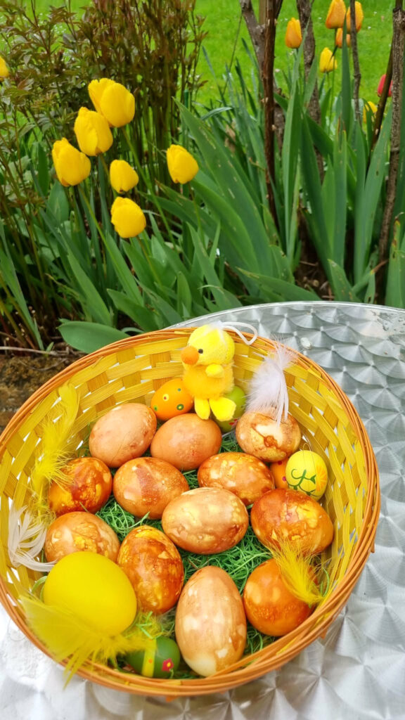 Seega enne lihavõttepühi tutvustasime prantslastele munade värvimist sibulakoorte ja värvilahustega. Sibulakoori kogume selleks sündmuseks juba terve aasta. Tõeliseks probleemiks kujuneb alati valgete munade muretsemine, sest enamasti müüakse Prantsusmaal pruune mune, aga nende peal ei jää sibulakoortega värvimisel värvid nii erksad ja ilusad kui valgete munade peal. Täiesti anekdootlik lugu on, kuidas siia saabudes esimesel aastal kohalikus talus valgeid mune küsisime ja vastuseks saime: „Mis asjad need valged munad on?“ Hästi otsides oleme ikka leidnud või siis Saksamaalt kaasa toonud (mu abikaasa on sakslane). Nii lastele kui suurtele meeldib väga eestlaste munade koksimise komme, kusjuures eesmärgiks on koksida nii, et enda muna terveks jääks ja vastase oma katki läheks. Sealjuures loeme munaloitsu: