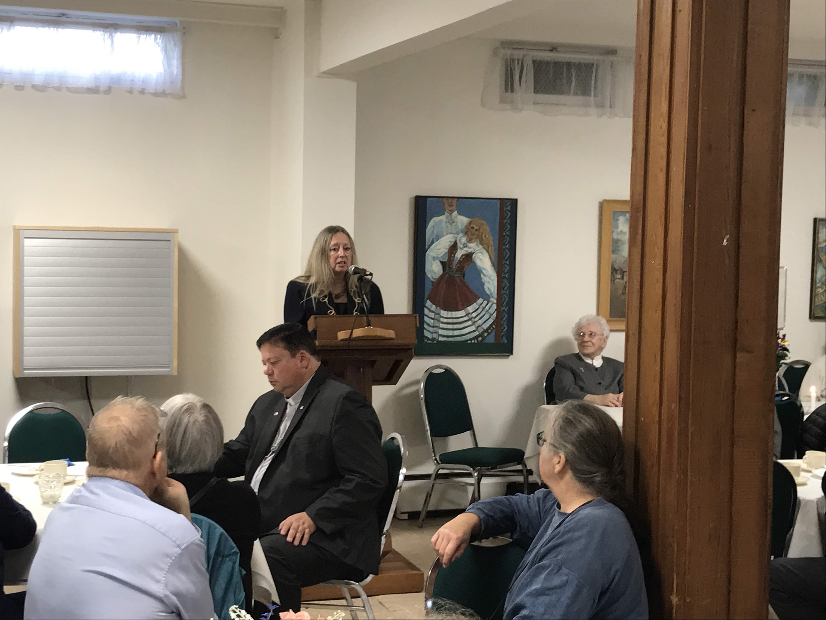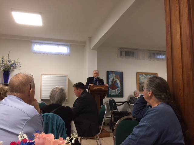 Leo Allas kõnelemas kohvilaua-koosviibimisel. Õp. Algur Kaerma ja kirikulised kuulavad. Osa võtsid külalised luterikogudusest, baptistikogudusest ja õigeusukogudusest. Foto: Arne Tork (2019)