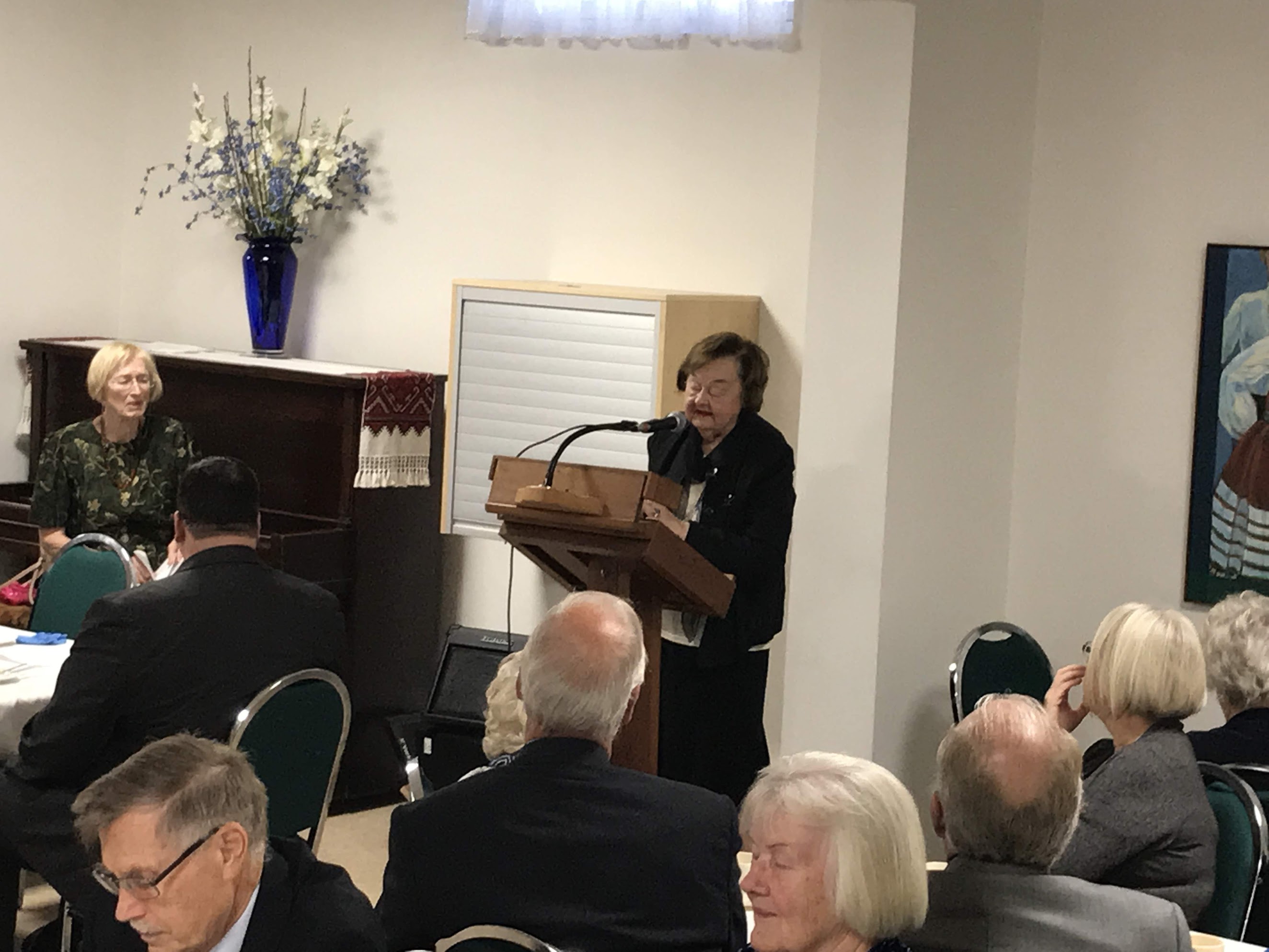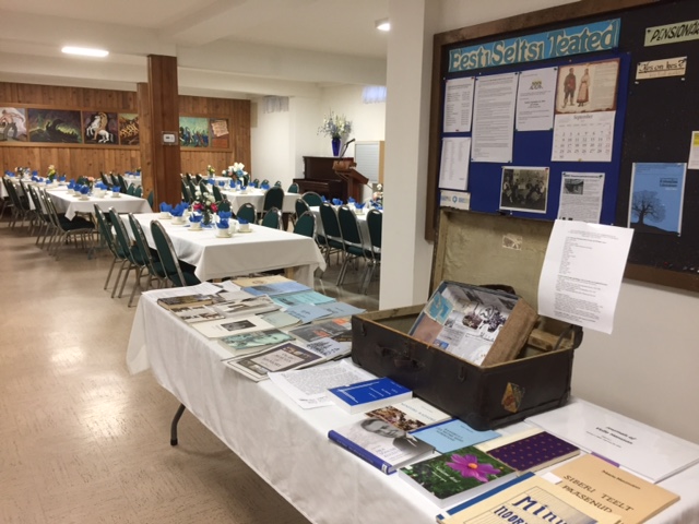 Meie Kodu allkorrusel oli välja pandud suurpõgenemist meenutaval sündmusel väljapanek Vancouveri eestlaste mälestusraamatutest, keskel püüab pilku Hilja Hanssoni põgenemisteel kaasas olnud kohver ja kunst, millest on juttu Algur Kaerma kirjutises. Foto: Arne Tork (2019)