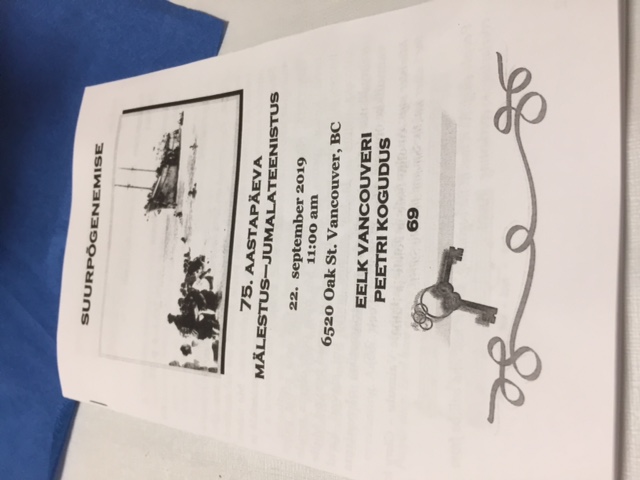 Pühapäeva, 22. septembri hommik 2019 oli Vancouveris vaikne. Vaid tasane tuulevine tõstis eestlaste Meie Kodu ja Eesti Kiriku parkimisplatsi servalt lendlema punakollaseks värvunud vahtralehe. Suve lõpp andis enesest märku. Madal päikesekaar oli veel piisavalt soe, et siluda kuldseid mälestuskilde Eestis toimunud suvisest XXVII laulu– ja XX tantsupeost; ent sellekski, et teha pai 75 aasta tagustele meenutuste hingehaavadele, mis iga sügise lähenedes tundlikuks muutuvad… Minna ei tahtnud, aga jääda ei saanud.