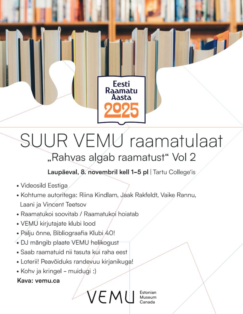 Kuna 2. märtsil aset leidnud raamatulaat kujunes väga populaarseks, otsustasime seda korrata. Ürituse üks eesmärke on enne 2026.a kevadel algavat VEMU arhiivhoidla remonti lahti saada raamatutest, mis on VEMU kogudes juba olemas ja kipuvad nüüd duplikaatidena üle jääma. Anname kodutuks jäänud raamatutele koos uue elu! Laadal saate endale soetada põnevat kirjavara: ilukirjandust, mälestusi, erinevate valdkondade (sh ajaloo-alaseid) aimeraamatuid, lastekirjandust, kokaraamatuid jpm nii eesti kui inglise keeles. Kasutatud raamatud VEMU kogust on saadaval tasuta või vabatahtliku annetuse eest, laenuraamatukogu duplikaadid soodsa hinnaga. Aga laadalt saab osta ka uusi raamatuid, sh Kanada eestlaste poolt välja antuid.