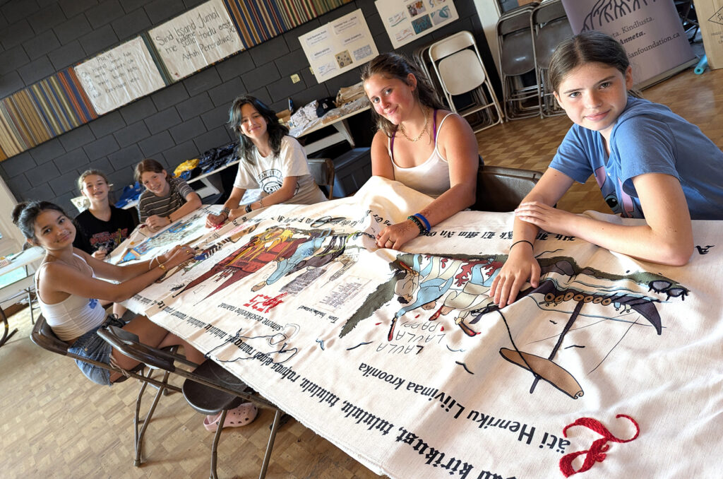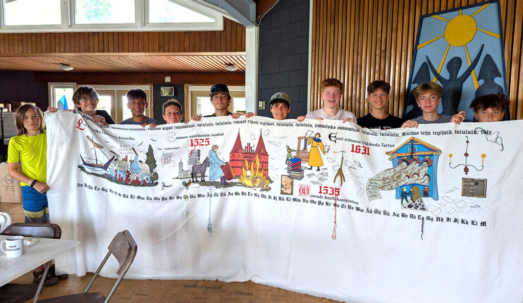 Eesti Raamat 500 tikkimise projekt Seedrioru lastelaagris. Diasporaa ühiskonnale tehti täpne koopia piltvaibast, mis Eestis ringi liigub. Tükk koopiast sai Piret Noorhanile; lootus on, et see saab tulevikus VEMUs eksponeeritud. Siin olev tükk on vaiba algus, aastast 1525+. See oli kasvandikkudele hästi huvitav, kuna oli viikingi moodi laev, loss, mõõgad, jne. Need tekitasid palju küsimusi Eesti ajaloo kohta. Foto: Merike Koger