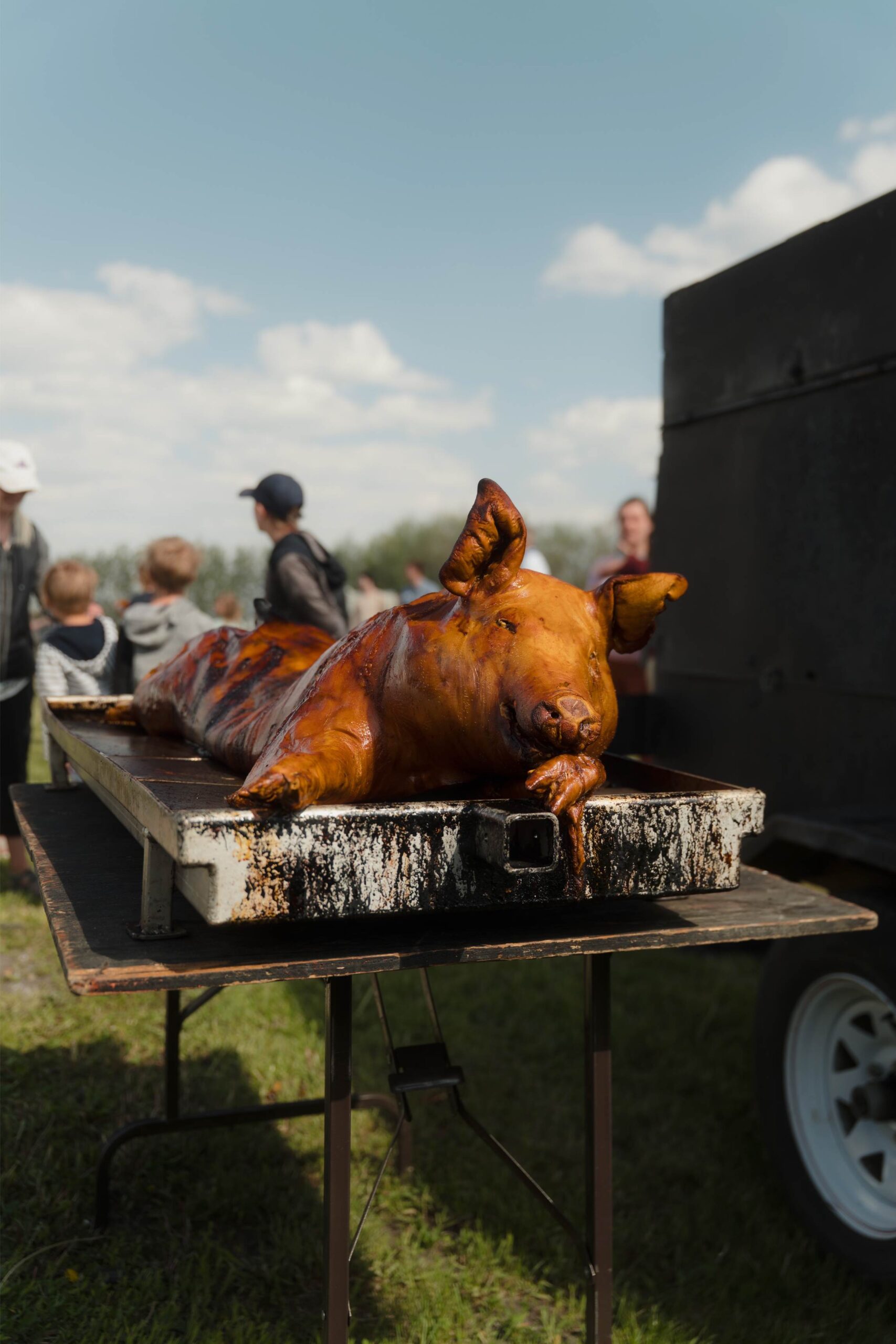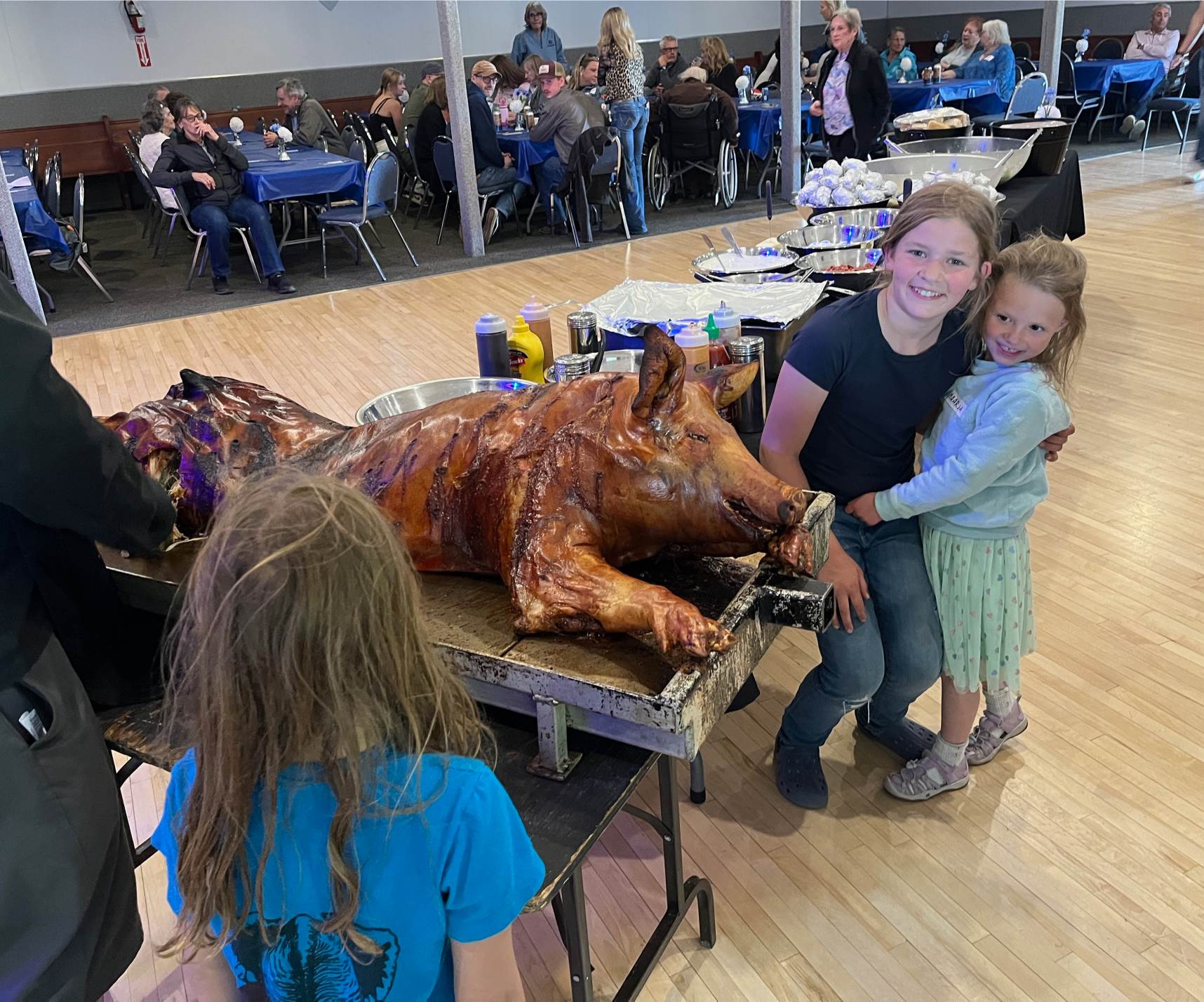 The traditional pig roast dinner and curious, hungry kids (photo by Kelly Schuler-McDonald)