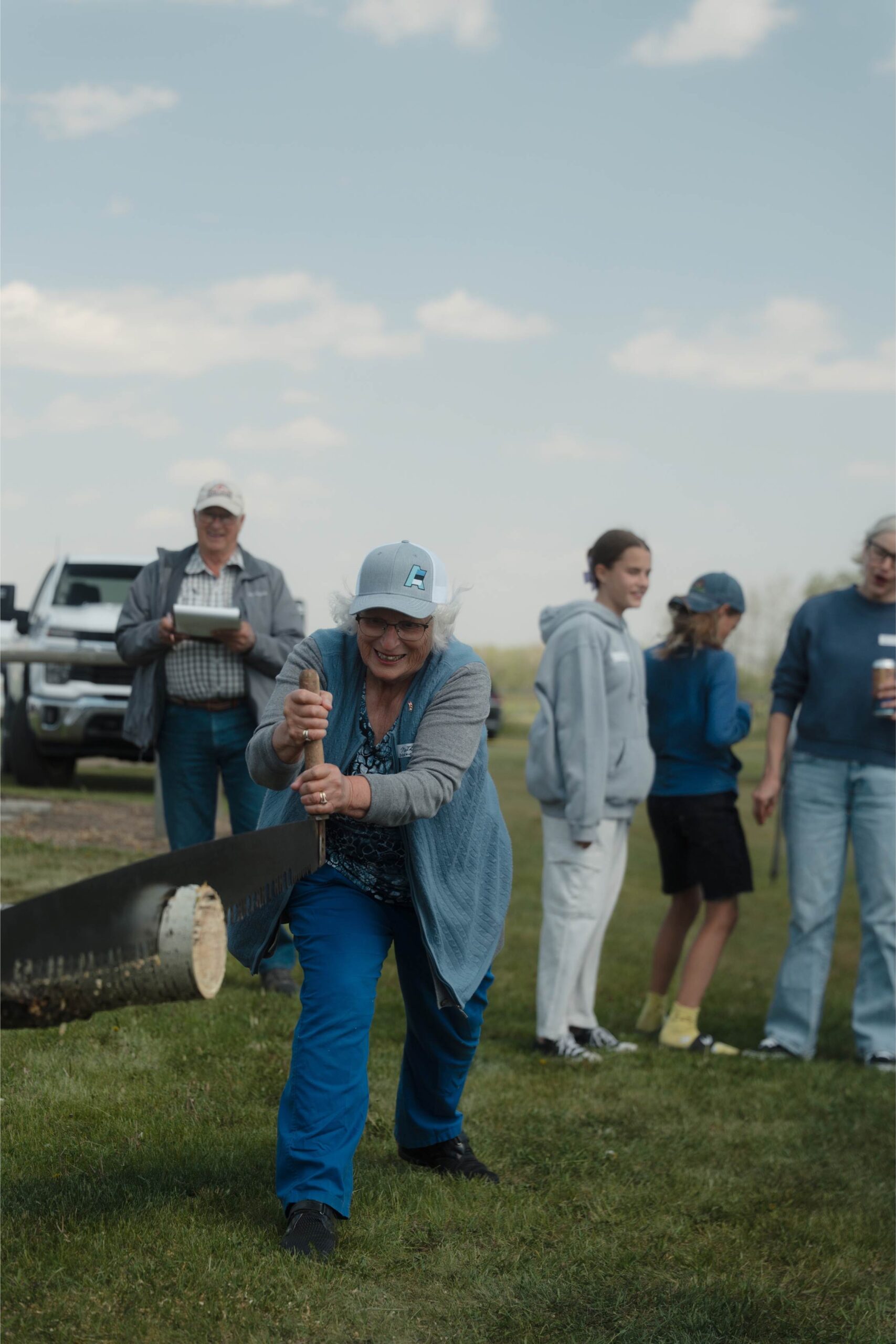 An octogenarian log sawing contest participant, Martha Munz Gue (photo courtesy of AEHS, by Mitch Fodor)