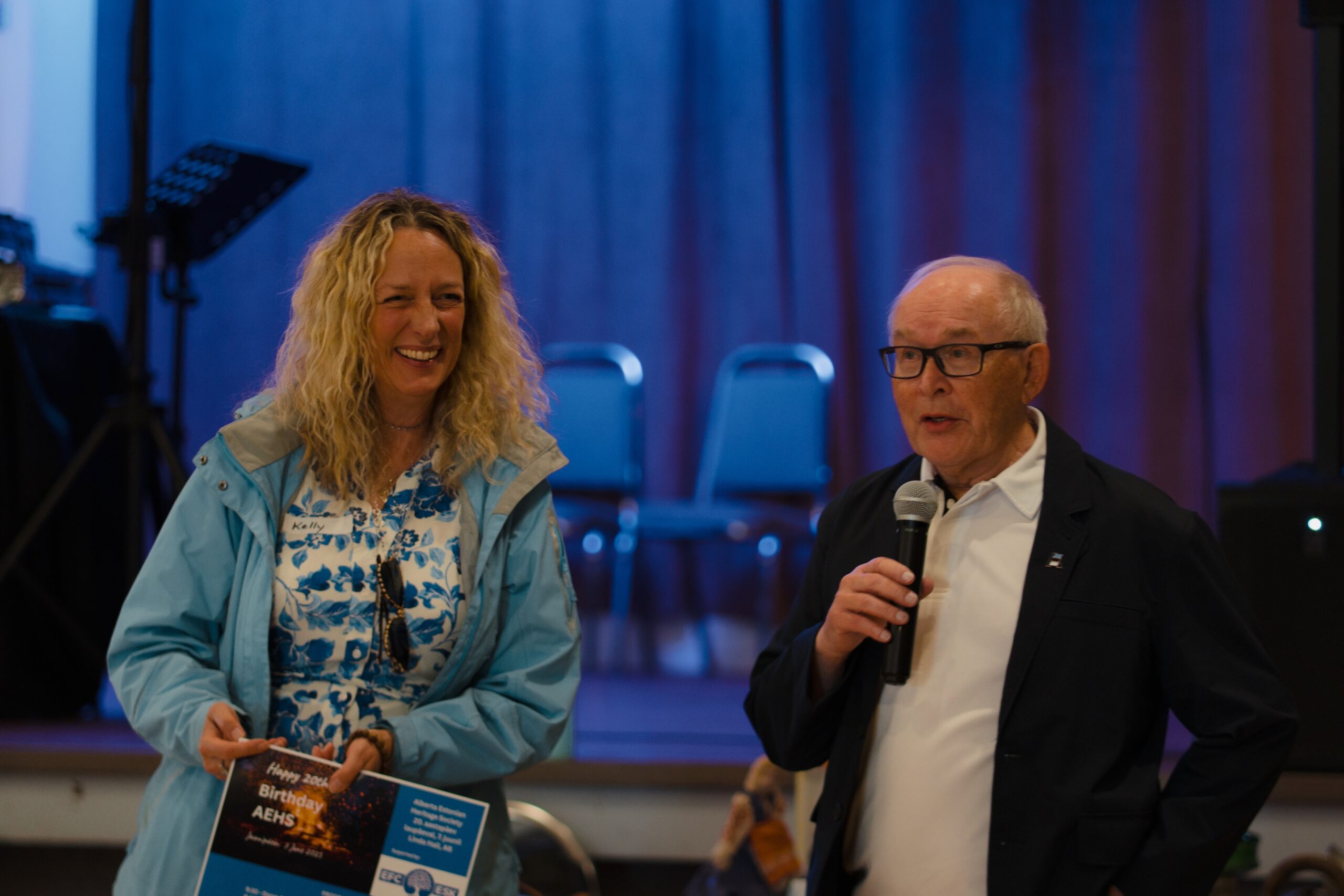 AEHS current President, Kelly Schuler-McDonald with Bob Kingsep who regales the crowd with his AEHS stories as a past President (photo courtesy of AEHS, by Mitch Fodor)