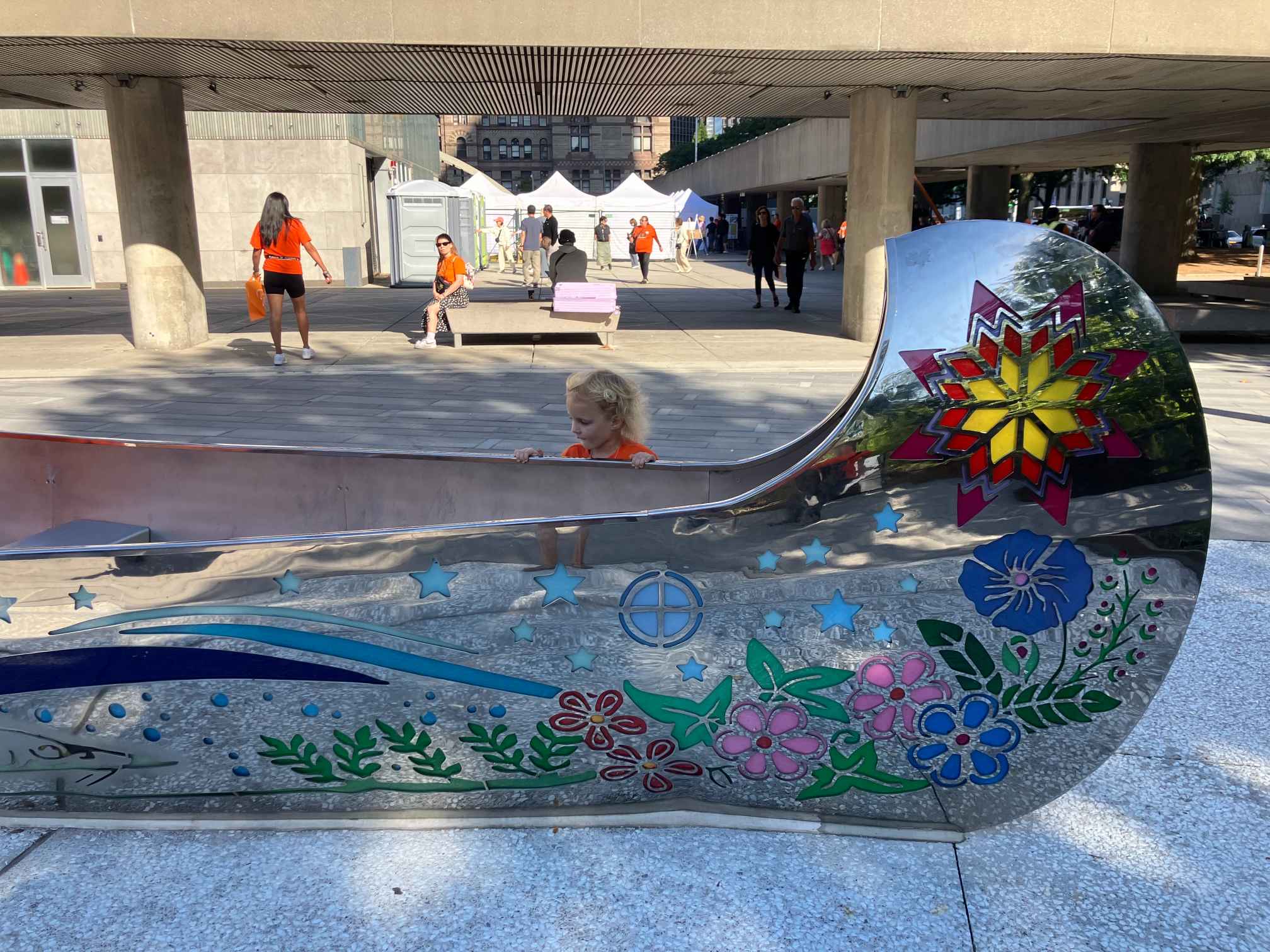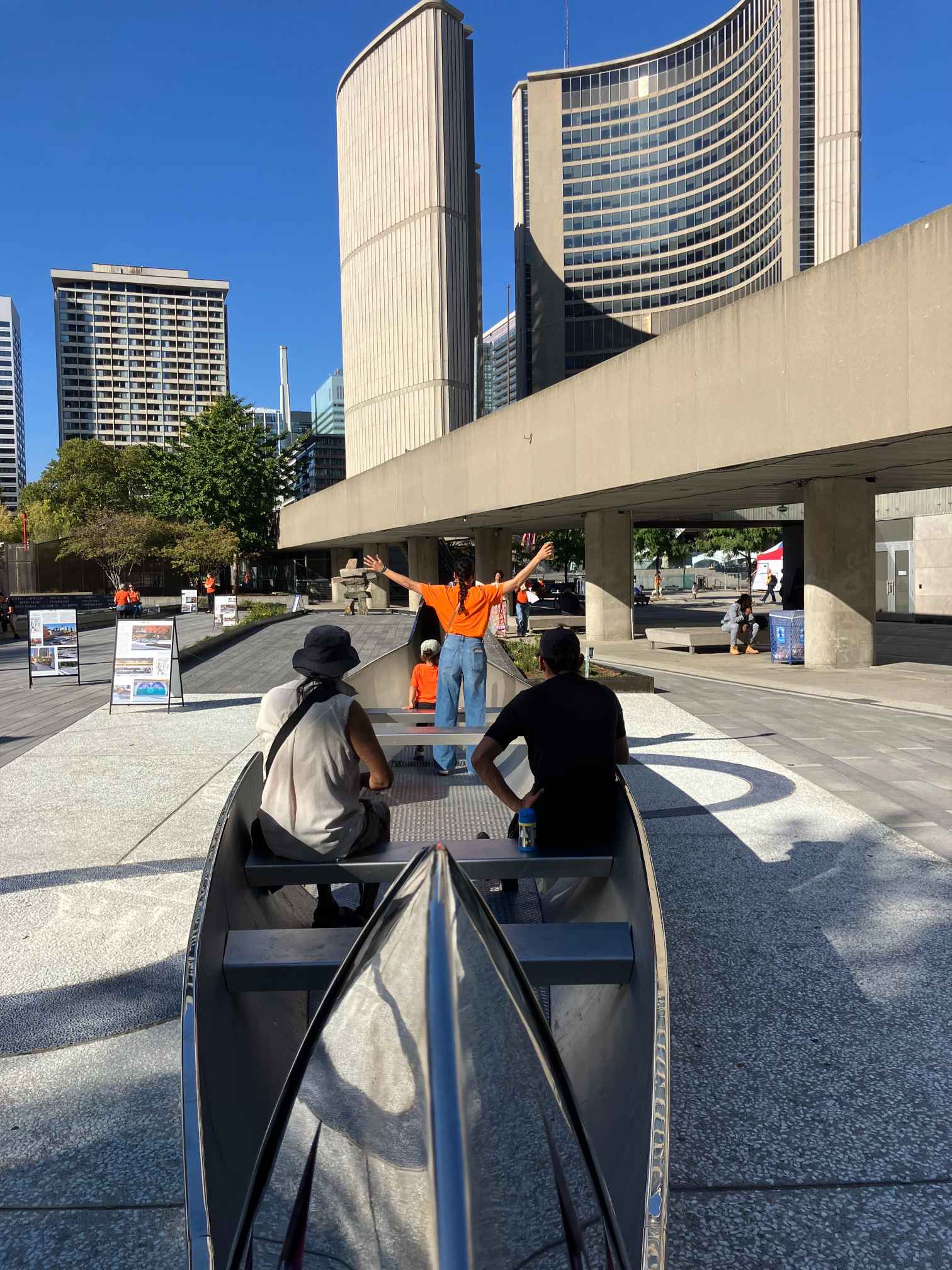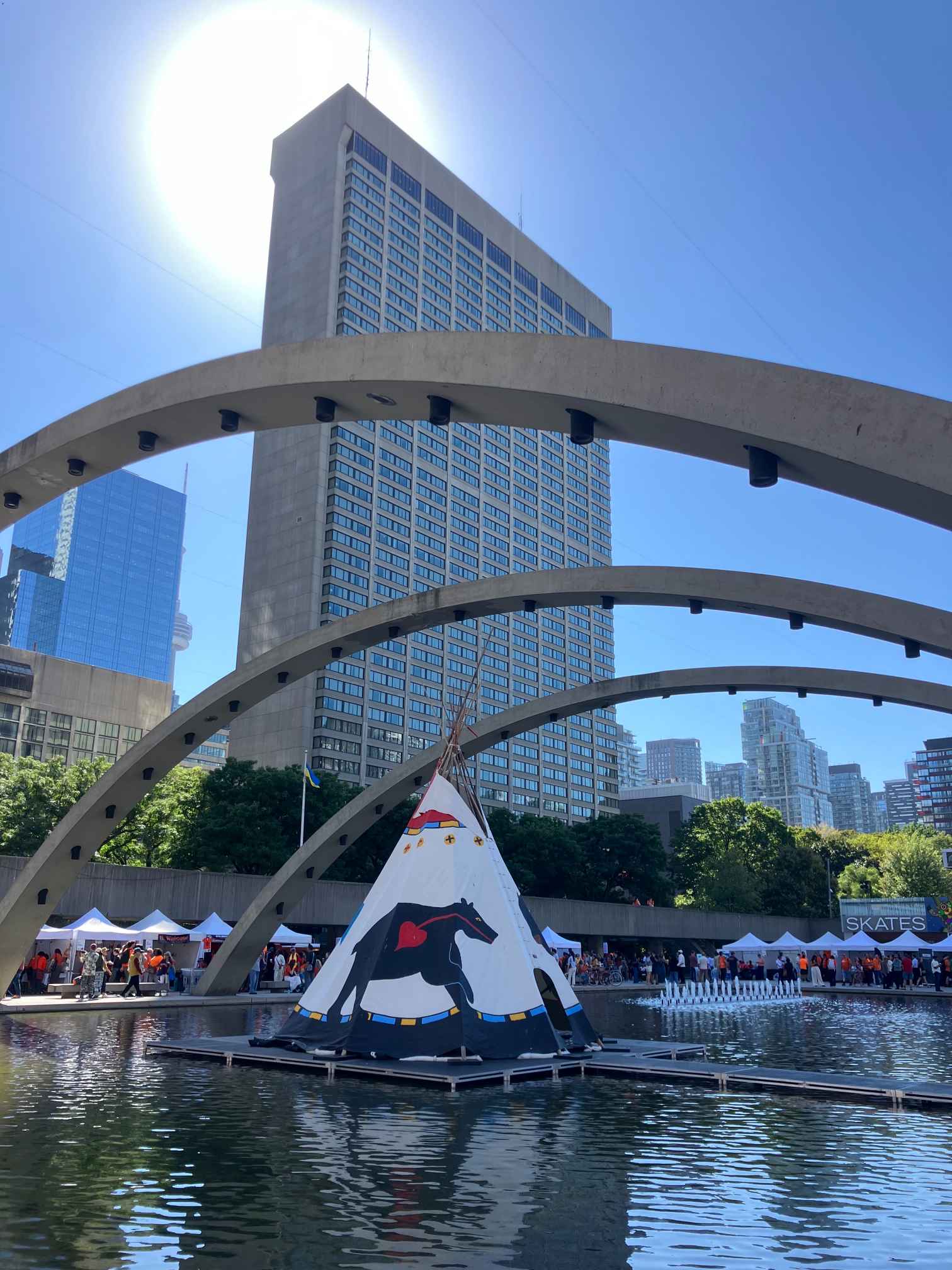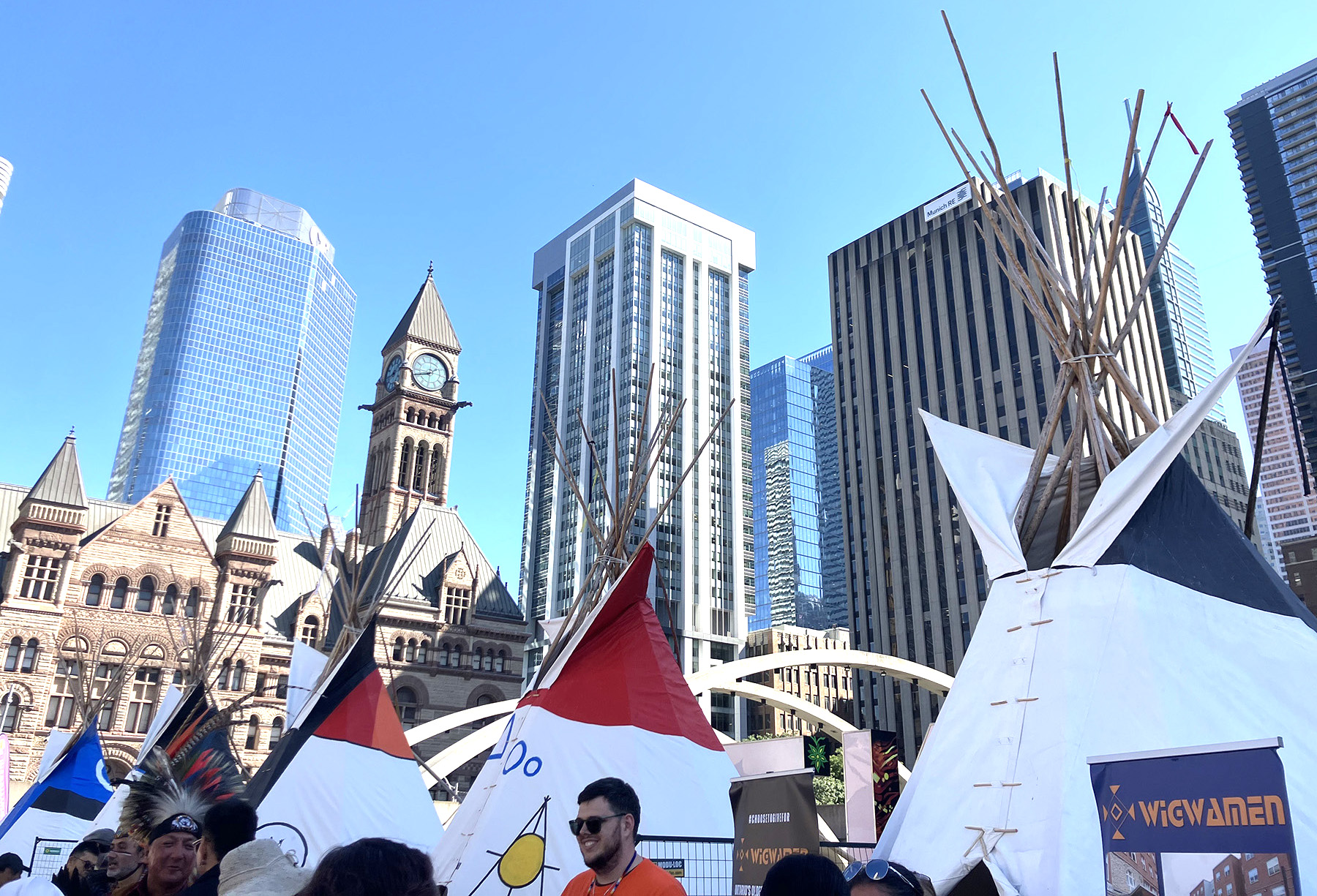 Saabudes võttis avanev vaatepilt tõsiselt pahviks. Püstkojad, neid võis olla oma viisteist tükki vähemalt ümber platsi, taustal terasest ja klaasist hooned ja pilvelõhkujad. Terve Toronto hiilgav hilisajalugu, tööstuse ja ärinduse edulugu, sipelgapesana kihava südalinna ja vana Raekoja tornikella kõminaga. Ja selle keskel, AUKOHAL tipi-d, juhtumisi väga sarnased meie esivanemate ja eriti meie põhjapõdra karjadega koos liikuvate hõimurahvaste püstkodadega.