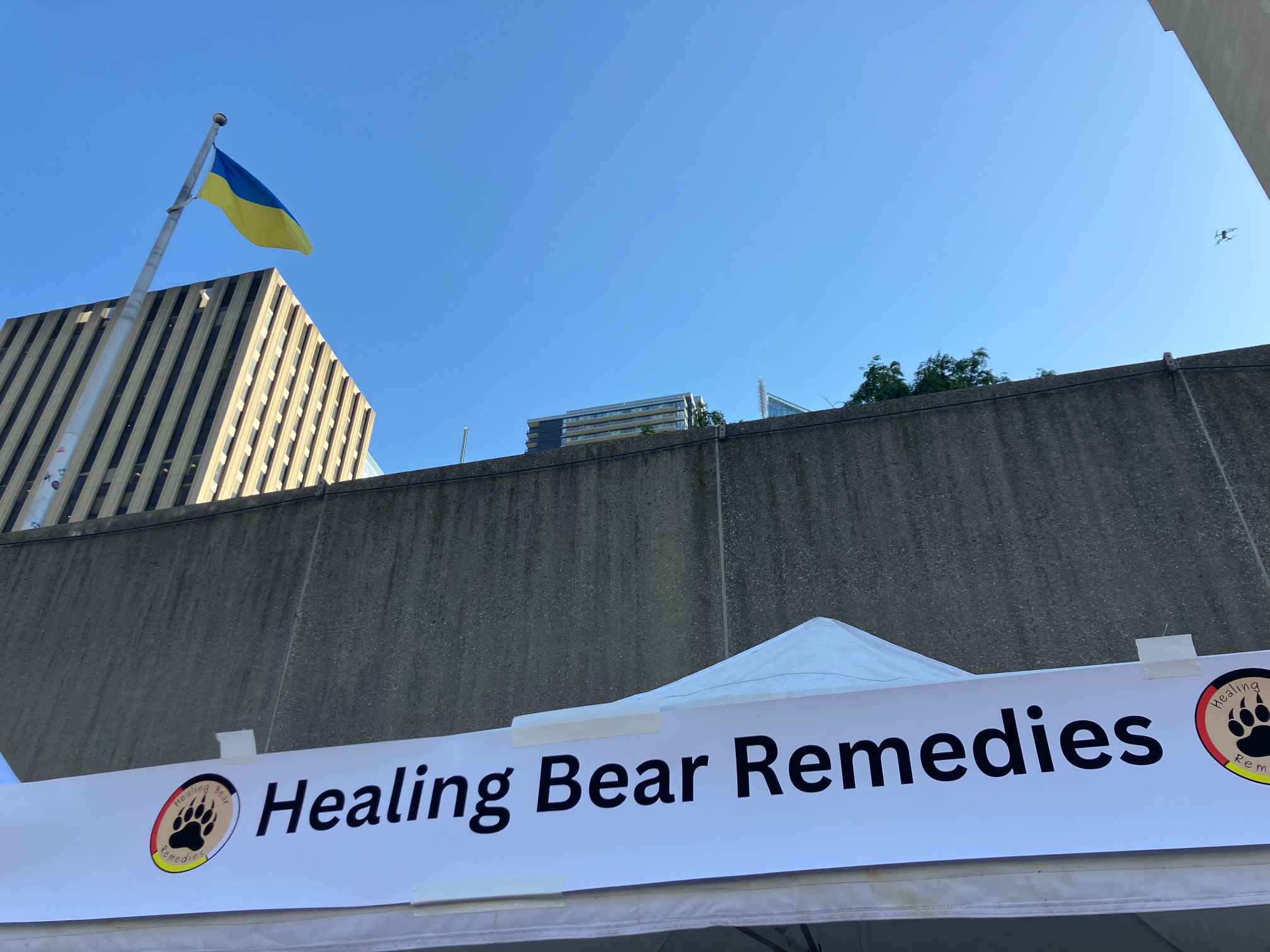 Nende vastas, Queeni tänava poolsel kõrgemal äärel lehvis kõige kohal Ukraina lipp. Ning Ukraina lipu all olevas telgis tutvustati ja müüdi muuseas kirevaid lillelisi rätte, millesarnased ei ole eestlastelegi võõrad ning kantakse mõnegi meie rahvarõiva komplekti juurde õlarätina. KOKOM’i ehk ukraina õla- ja pearätt sümboliseerib põlisrahvaste suhteid Kanadasse saabunud Ukraina asunike toetamisel. Põlisrahvaste ja ukraina naised vahetasid neid rätte omavahel preeria provintsides ja mujalgi. ,,Meie kultuuride vahel on palju sarnasusi ja tänapäeval esindab sall meie ühtsust,“ märkis rätte müüv proua.