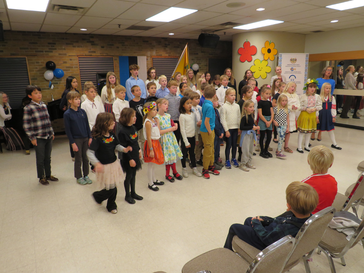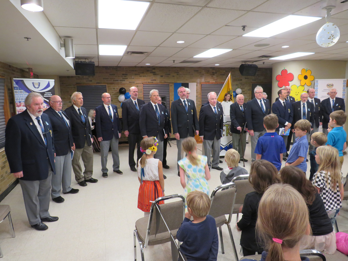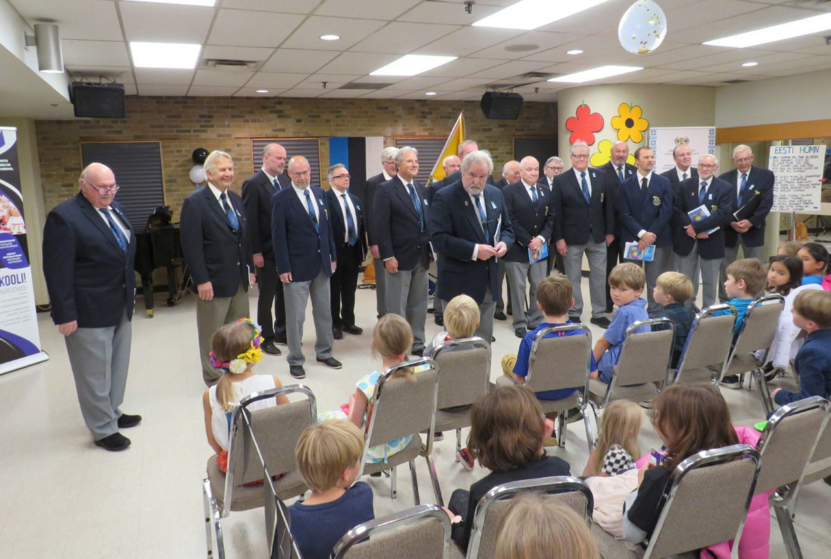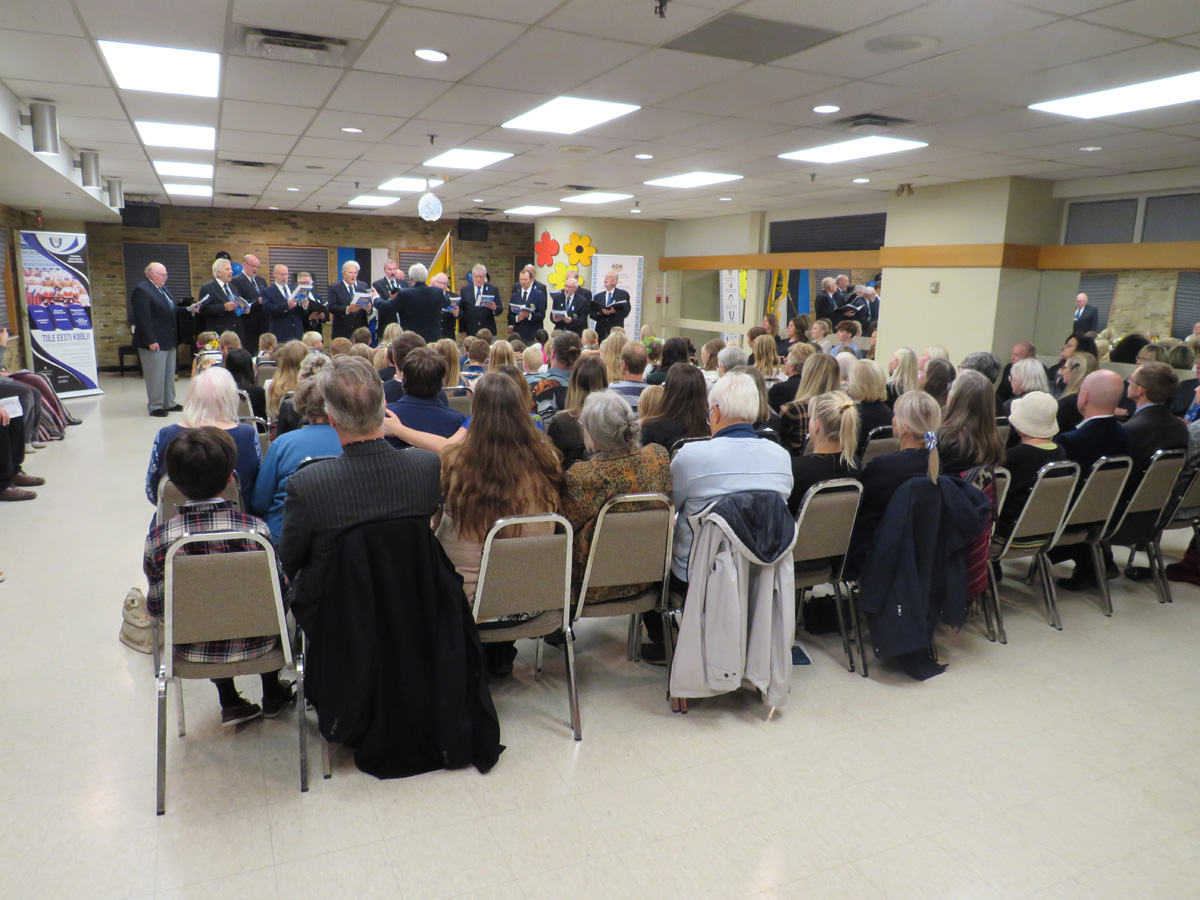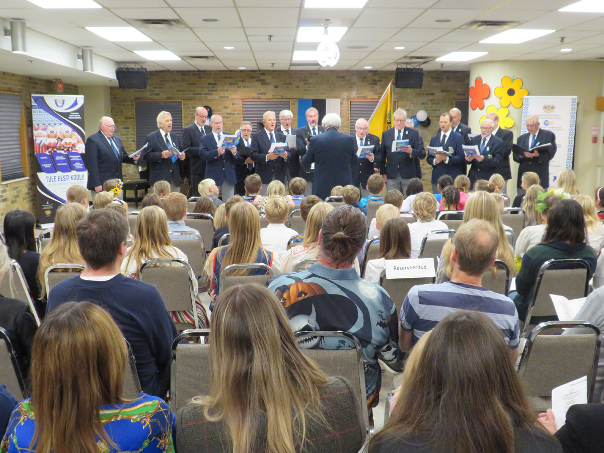 Pidulik õhtu aga algas traditsiooniliselt kooli lipu saalitoomisega (Timo Spence, Aivi Teene, Leili Raffelini) ja Eesti hümni laulmisega. Kaasa aitas Toronto Eesti Meeskoor, kes harjutab eesti kooli õhtu toimumisega samal ajal Läti keskuses. Külaliseks olnud meeskoor Avo Kittaski juhatusel esitas kolm laulu, alustades juubeleiks väga sobivate J. Simmi viisistatud: