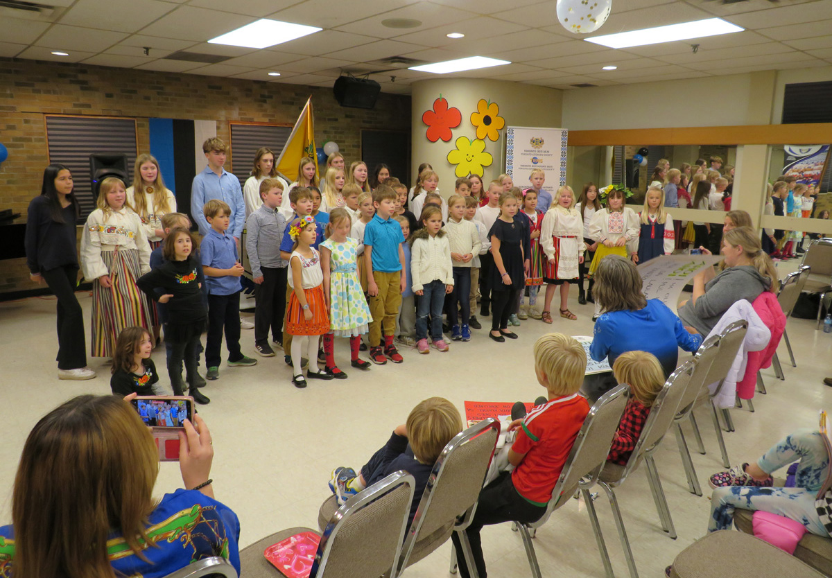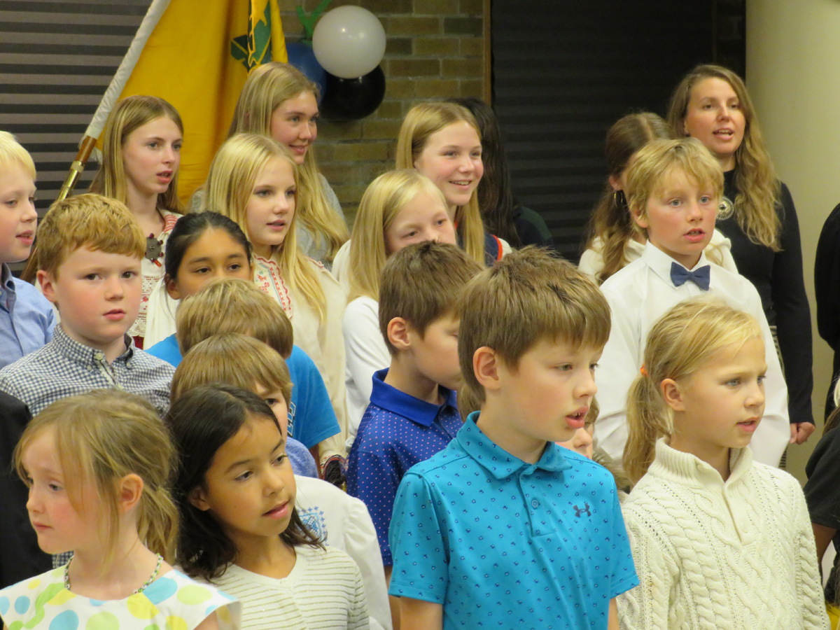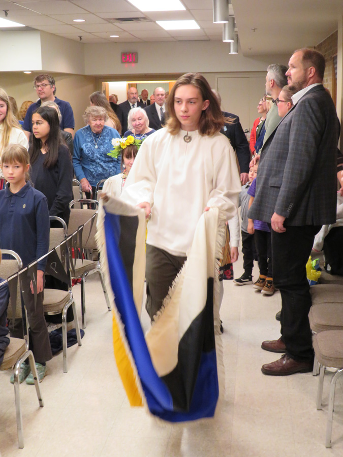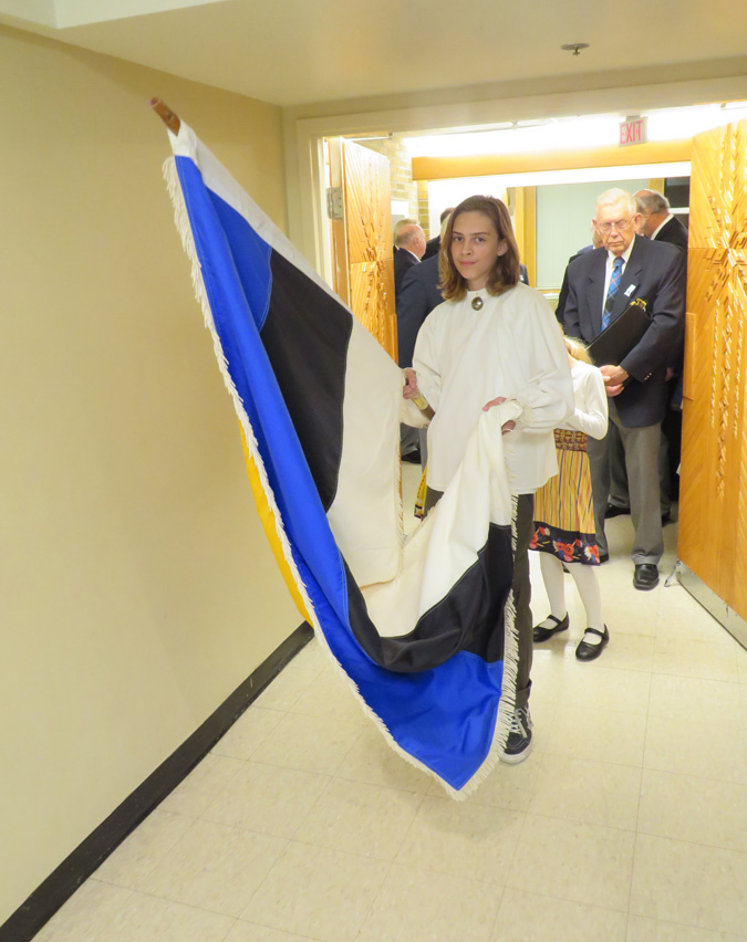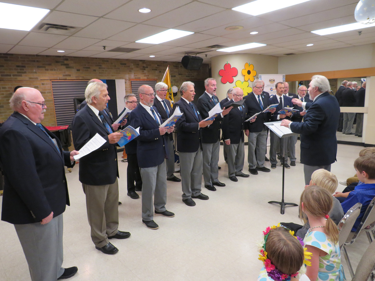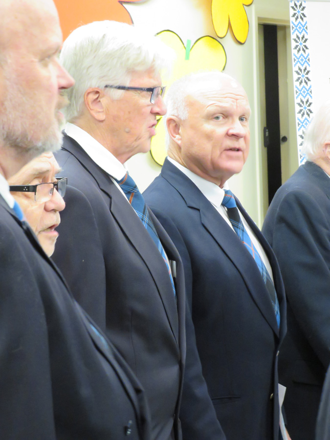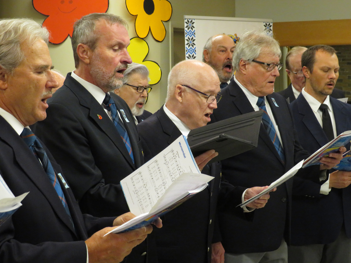 Pidulik õhtu aga algas traditsiooniliselt kooli lipu saalitoomisega (Timo Spence, Aivi Teene, Leili Raffelini) ja Eesti hümni laulmisega. Kaasa aitas Toronto Eesti Meeskoor, kes harjutab eesti kooli õhtu toimumisega samal ajal Läti keskuses. Külaliseks olnud meeskoor Avo Kittaski juhatusel esitas kolm laulu, alustades juubeleiks väga sobivate J. Simmi viisistatud: