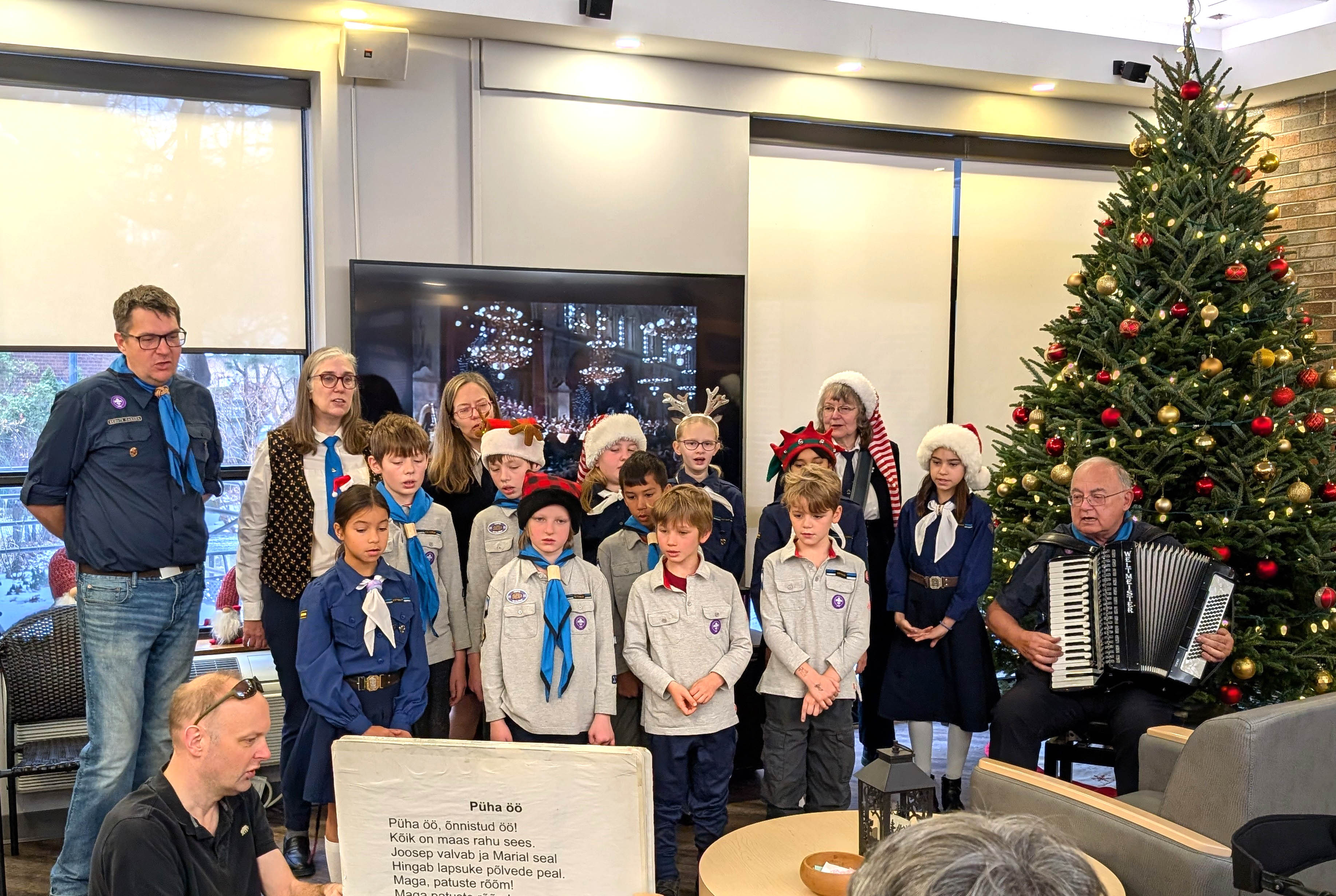 Toronto eesti hellakesed ja hundud koos juhtidega külastasid Ehataret laupäeval, 6. detsembril. Esineti kahe konserdiga, esmalt neljandal korrusel hooldekodus galeriisaalis ja teiseks kaminasaalis, kus olid kuulamas ka külalised ja lapsevanemad. Repertuaar on sama igal aastal, mitmed hästi tuntud eesti jõululaulud, millele said elanikud kaasa laulda. Akordionil saatis lauljaid skm Enno Agur.