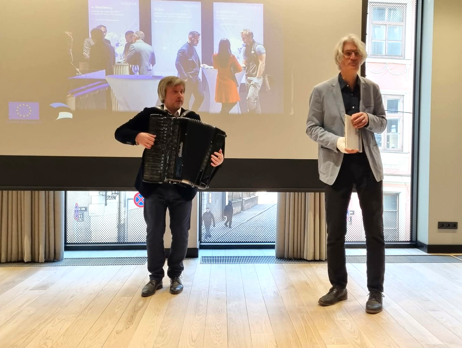 Eesti suursaadik Riias Eerik Marmei tervitas soojalt kohalviibijaid. Luuletaja ja tõlkija Contra, kelle trepilt kinni püüdsime, rääkis paari luulereaga ilmaütlevast ja kaasaütlevast käändest ning andis teada järgmisel päeval Läti Rahvusraamatukogus toimuvast raamatuesitlusest. Läti tähistab programmiga „Läti raamat 500“ läti raamatu 500. aastapäeva sarnaselt äsja lõppenud Eesti raamatuaastale. Kirjanik Armin Kõomägi tutvustas luuleäppi Lullu, mis on kõigile tasuta kättesaadav ning kus igal neljapäeval kell 10 saab alla laadida uue luuletuse. See on hea võimalus ka luulekaugetele inimestele erinevate eesti kirjanike luuletustega tutvumiseks. Seejärel esines Riia Eesti Kooli ansambel „Rukkililled“ juhendaja Baiba Visendorfaga. Lapsed esitasid läti rahvalaule ja eesti laule (Raivo Kõrgemägi „Pajupillilgu“, Rein Rannapi „Väike lind“ ja Anu Rõõmeli „Tuhanded kodud“). Anna Matvejeva esitas Riine Pajusaare klaveripala „Hundid“. Siis võtsid esinemisjärje üle Ilmārs Pumpurs ja akordionist Rolands Zelčs ansamblist Hāgenskalna muzikanti (www.muzikanti.lv) ja saime koos laulda nii eesti kui läti keeles olemasolevaid laule, näiteks Biedrība „Skaņumāja“.